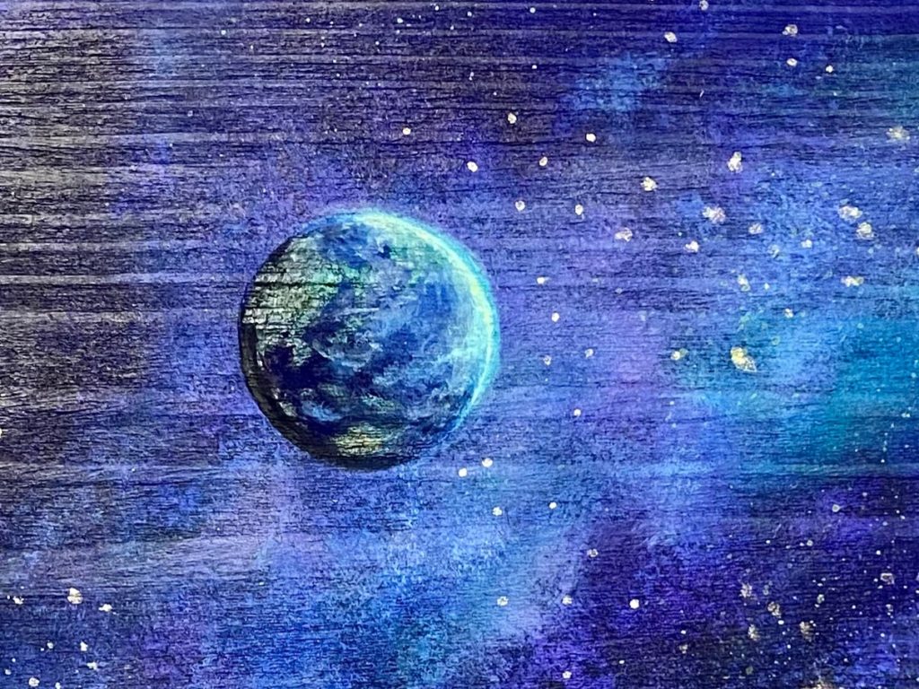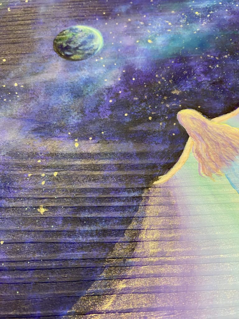 この世の中を救ってくださる弥勒様はどんなお姿なのだろうかと、私なりに想像して描きました。