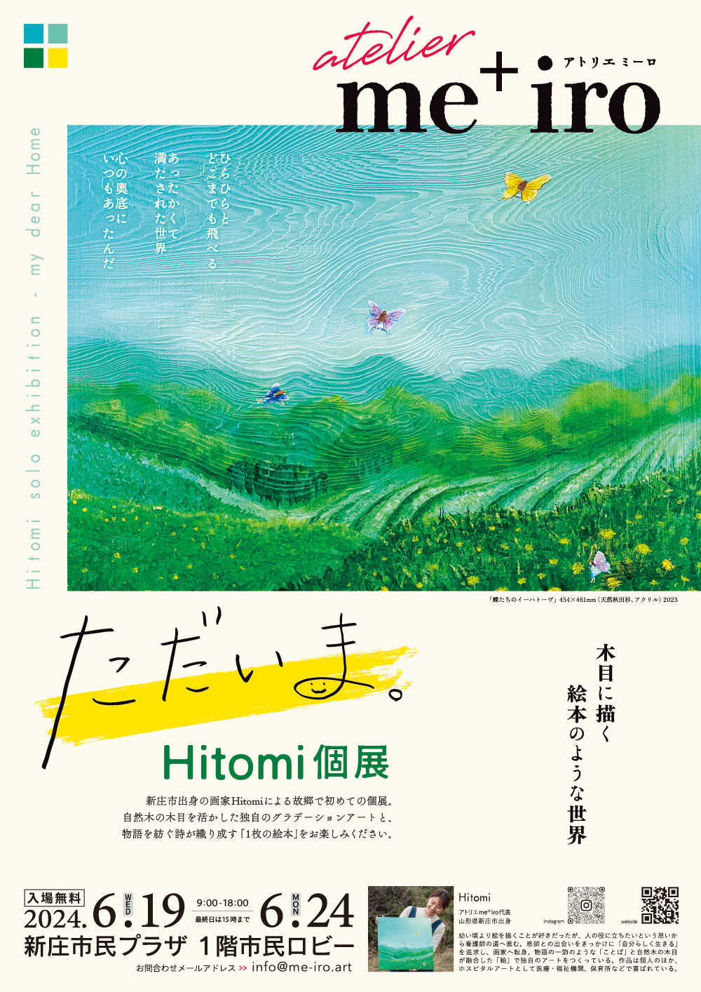 Hitomi個展 「 ただいま。 」 場所:新庄市民プラザ 1階市民ロビー とき:2024年6月19(水)→6月24日(月) 9時〜18時 ※最終日は15時まで 入場無料 山形県新庄市出身の画家Hitomiが初めて故郷で個展を行います。自然木の木目を活かし、何層も色を重ねてつくるグラデーションの木目アートは独自の技法です。絵と物語を感じる詩で「1枚の絵本」のようにお楽しみください。