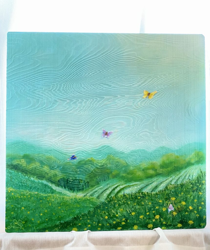 「木目に描く絵本のような絵画」で、国産の自然木のぬくもりとあたたかな物語をアートで表現している。